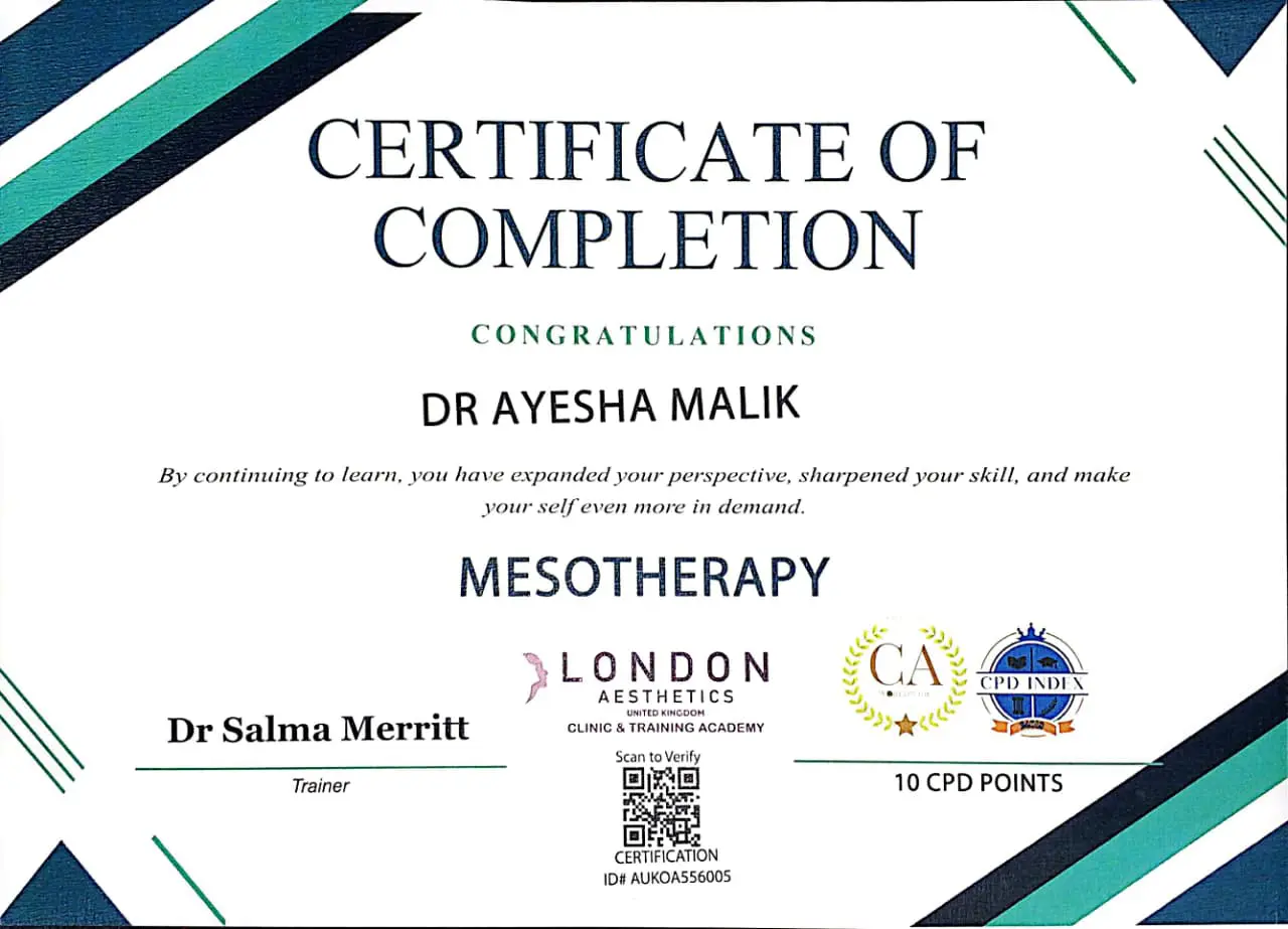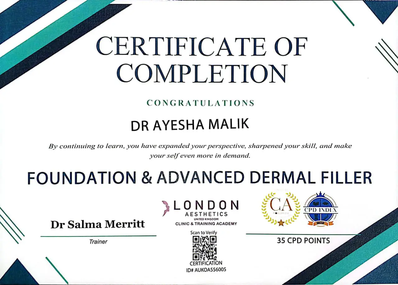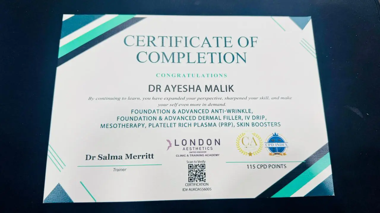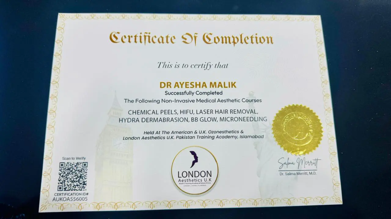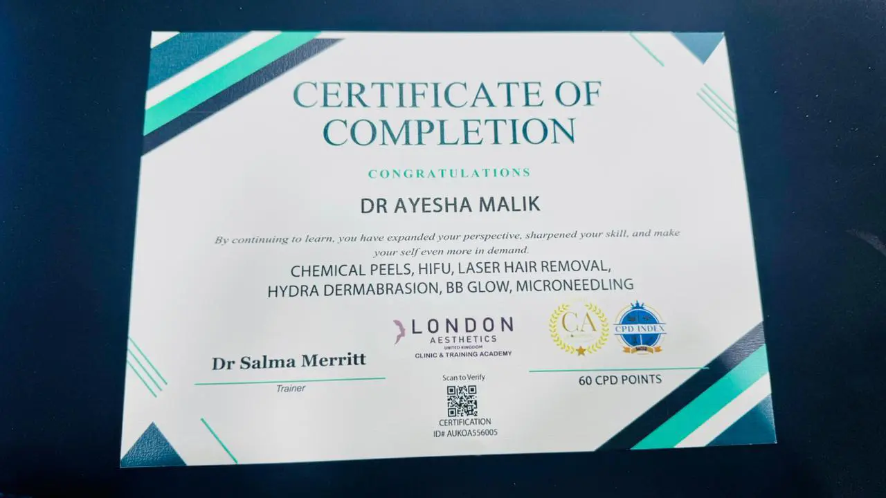 Dr Ayesha Malik completed her specialized Dermatology training at Combined Military Hospital (CMH), Multan. During this intensive program, she managed an outpatient department serving over 100 patients daily, gaining extensive expertise in both medical and cosmetic dermatology procedures.