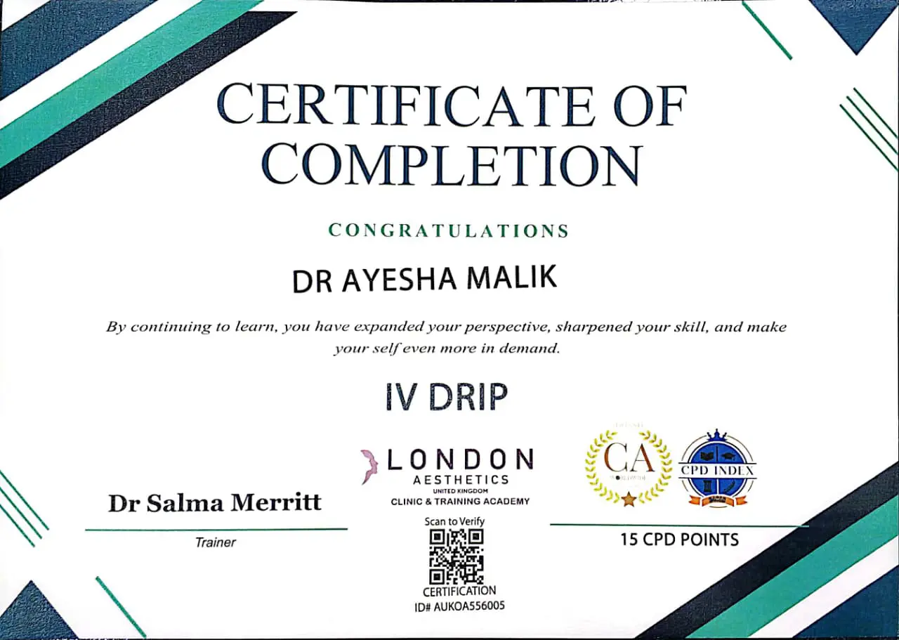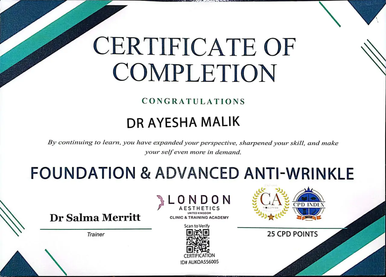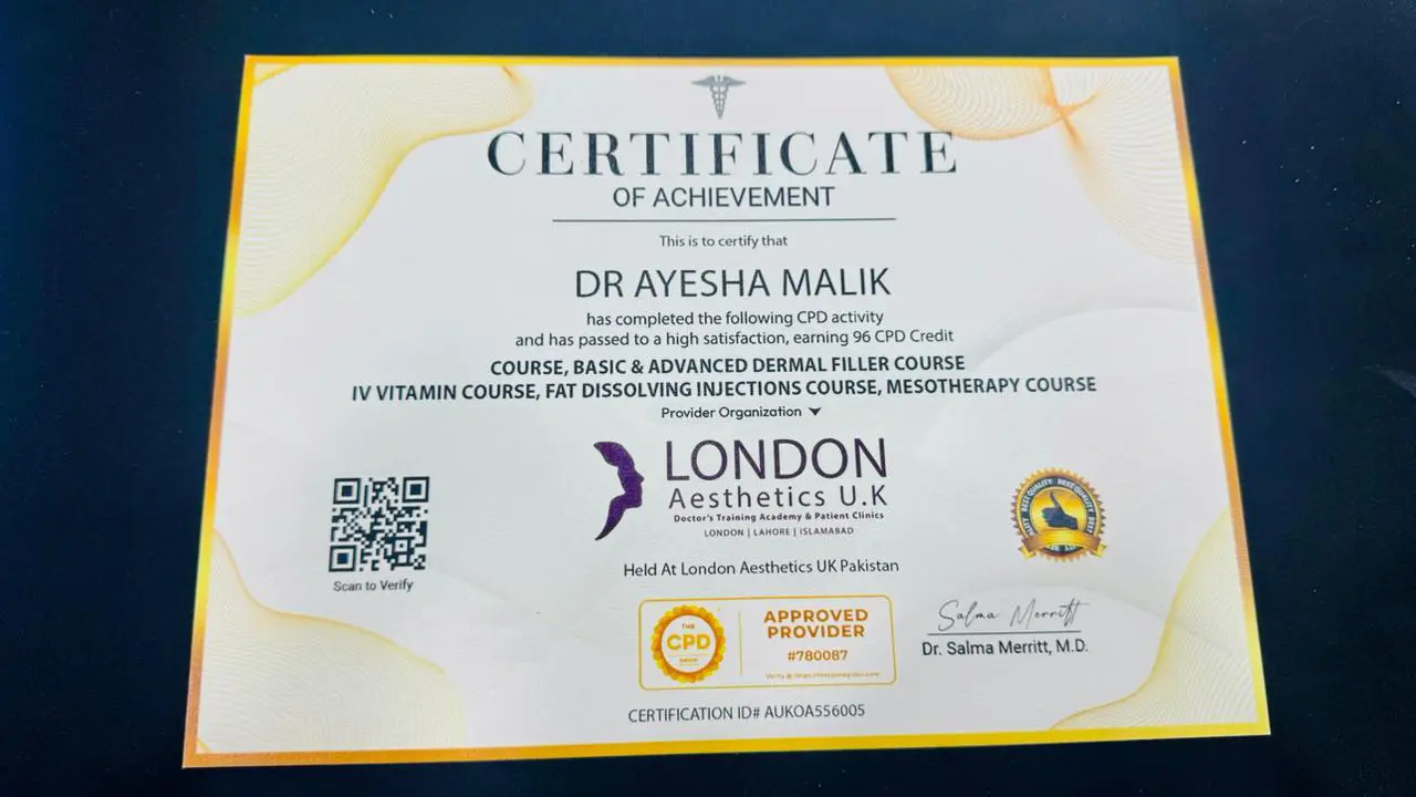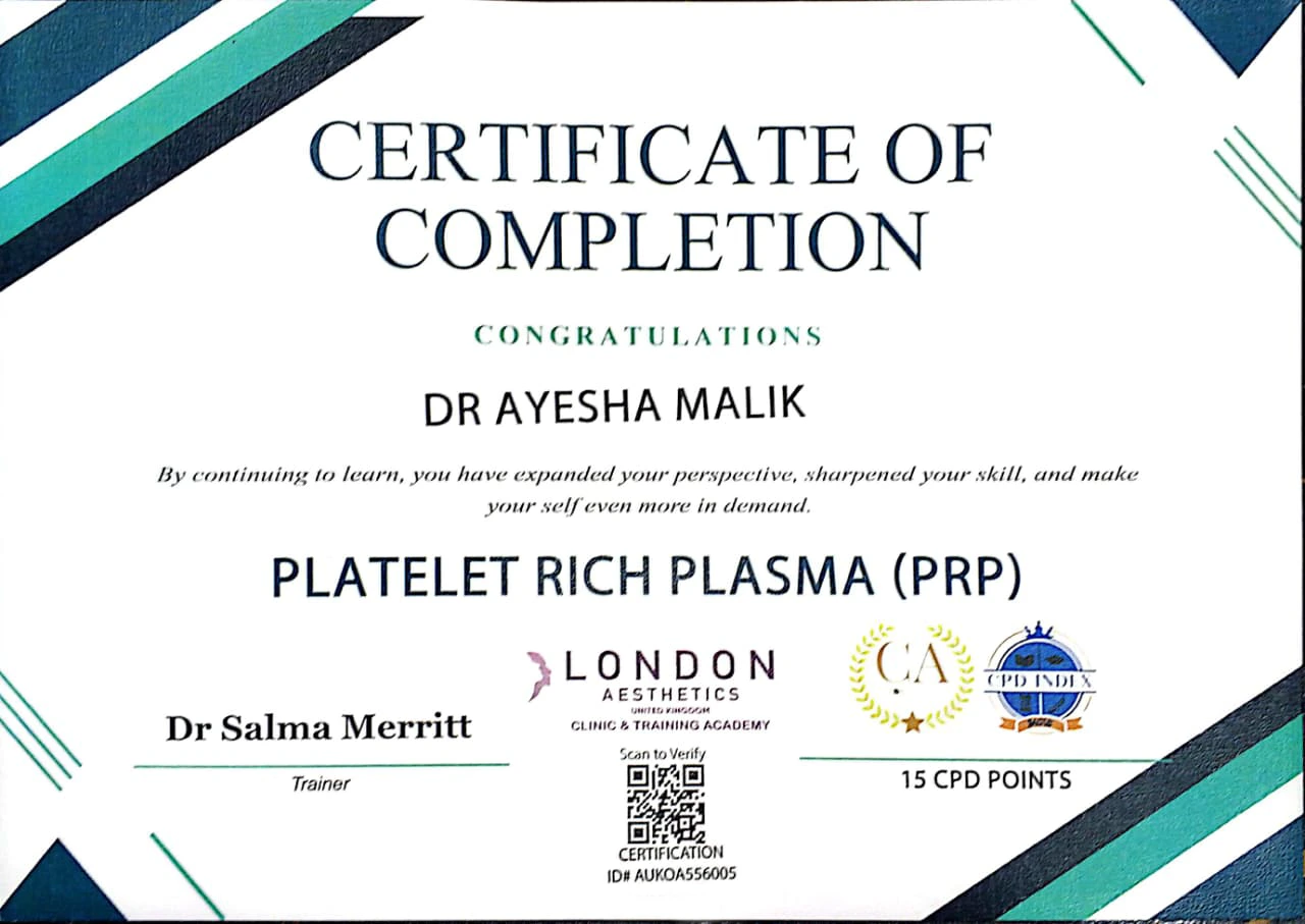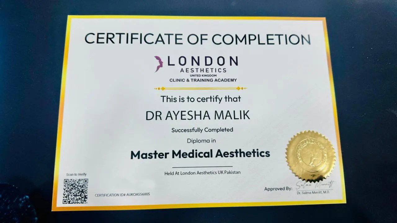 Dr Ayesha Malik completed her specialized Dermatology training at Combined Military Hospital (CMH), Multan. During this intensive program, she managed an outpatient department serving over 100 patients daily, gaining extensive expertise in both medical and cosmetic dermatology procedures.